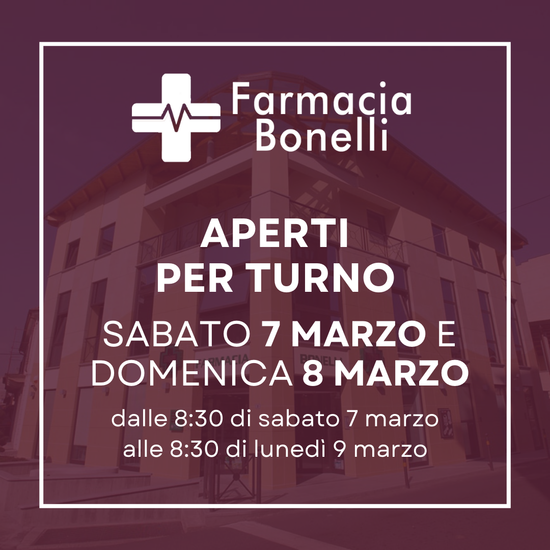 📅 La farmacia Bonelli è aperta per turno dalle 08:30 di sabato 7 marzo fino alle 08:30 di lunedì 9 marzo