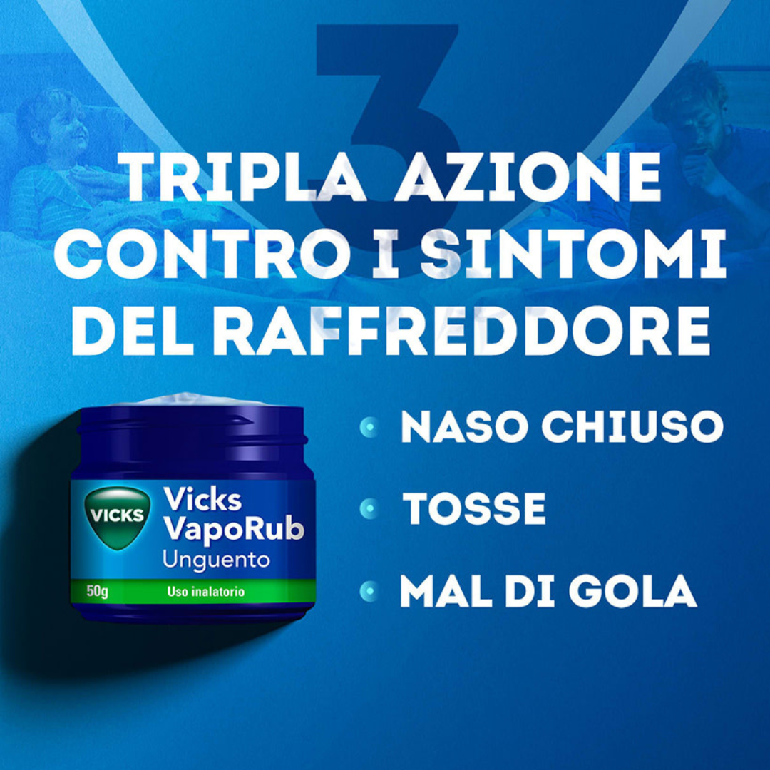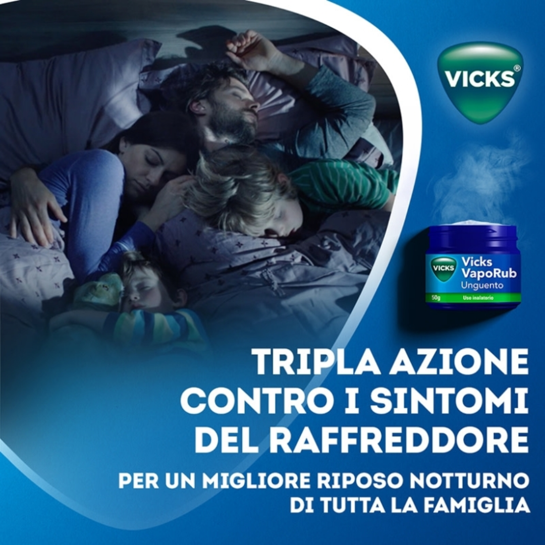 Vicks VapoRub è il trattamento indicato per tutta la famiglia che combatte i sintomi del raffreddore con tripla azione: libera il naso chiuso, calma la tosse e allevia il mal di gola.